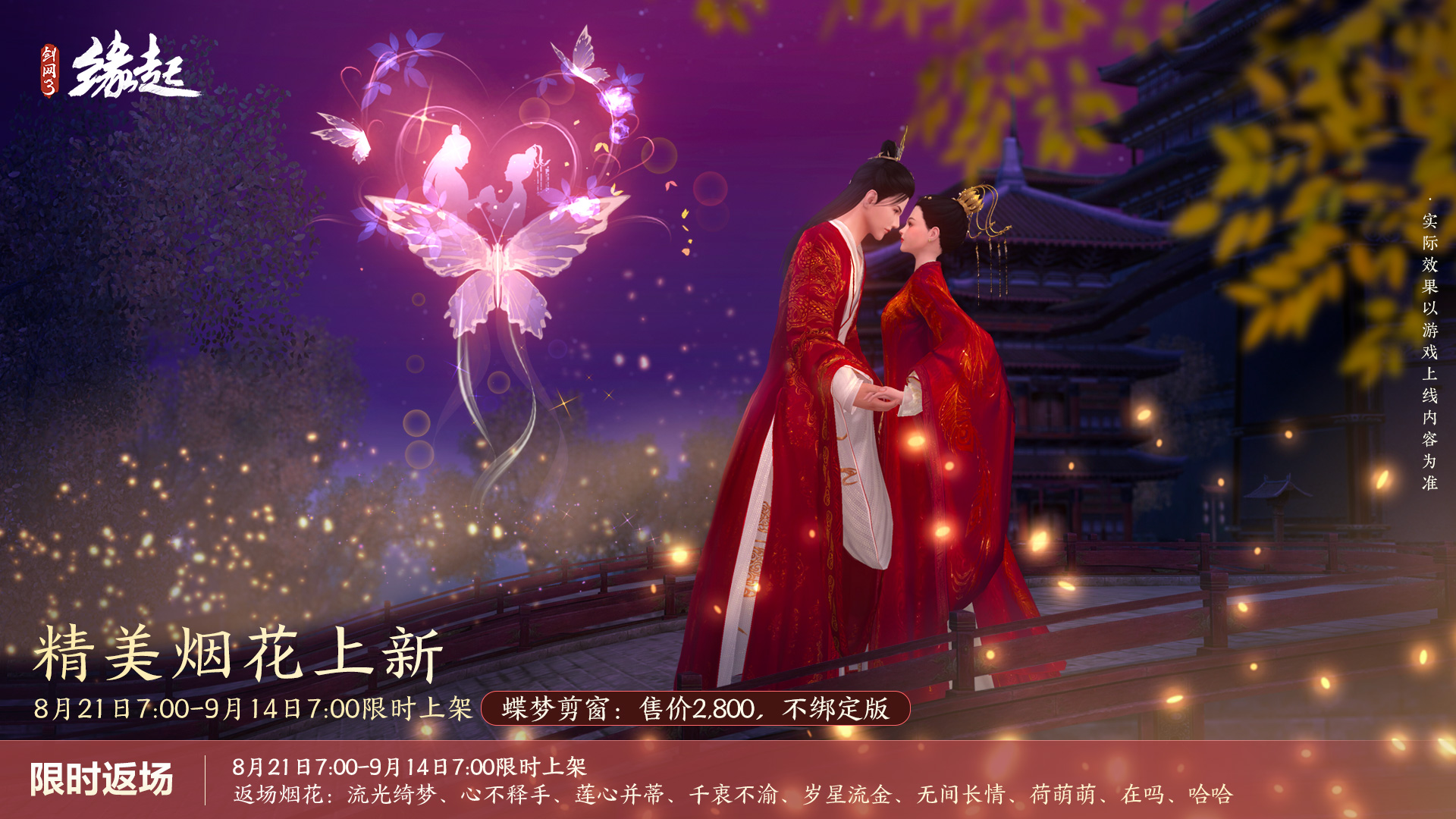 欢娱逢佳节,蝶梦寄情思,七夕主题纪念烟花“蝶梦剪窗”渲染节日的浪漫氛围!点燃烟花,心形样式配以群蝶环绕,祝福有情人永结同心!同期更有经典烟花和趣味烟花限时返场,双重庆典烟花更添喜意!