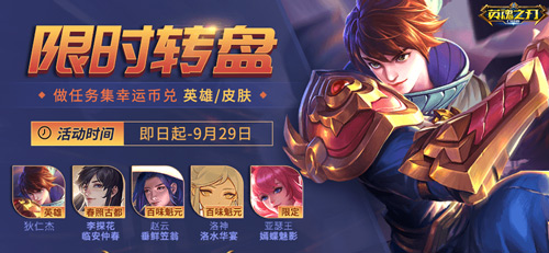 9月23日至9月29日,参与限时转盘完成每日登录、对局等任务,集幸运币兑换狄仁杰、李探花-临安仲春、亚瑟王-嫣蝶魅影、赵云-垂鲜笠翁、洛神-洛水华宴等珍贵好礼!
