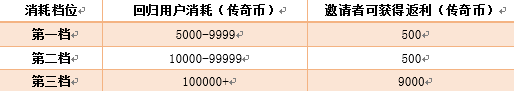 2、回归用户登录游戏,在游戏内消费传奇币达到一定档位时,即视作完成回归任务。邀请人可以获得其消耗的对应档位的传奇币返利。档位如下: