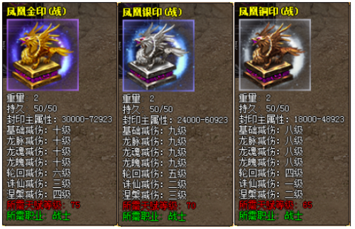 封印系统中新增【凤凰金印】、【凤凰银印】和【凤凰铜印】,佩戴后可大幅增加伤害和减少基础、龙脉、龙魂、龙魄、轮回减伤、诛仙减伤、涅盘减伤。