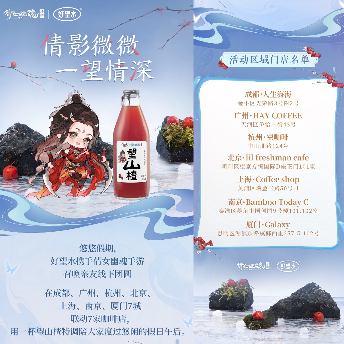 倩影微微,一“望”情深,假期出游,有联动特调饮品,宅在家里,也有倾心好礼相送。倩女手游与成都、广州、杭州、北京、上海、南京、厦门7座城市的7家精品咖啡店合作,用一杯清甜飒爽的望山楂特调饮品陪你度过悠闲假期,到店购买指定饮品,即可领取丰厚倩女手游周边奖励。