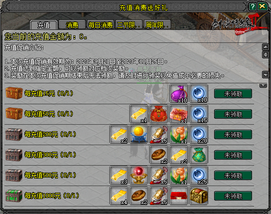 万元现金,等你来抽!9月21日9:00,9月充消活动开启!参与充值消费活动即可享受充值奖励、消费奖励、每日消费奖励,及特别的限时消费奖励哦,有各种等级直升丸子、经脉丹,大量再赴山海抽奖券等赠送,助力每位大侠成长。充值多多,奖励多多!