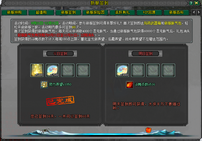 新服每日签到,做活跃一条龙,可得凤鸣武器箱、海量脉气银券、凤鸣玄晶、强化精石等,还有永久飞剑坐骑、挂件饰品等,轻松搞齐装备开启帅气新服之旅!