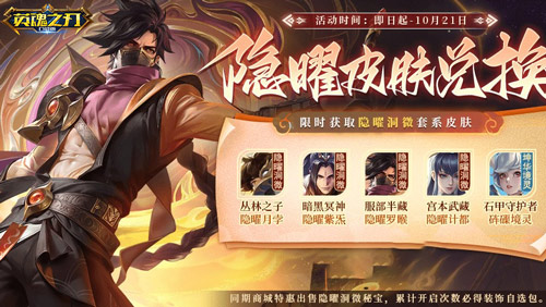 10月15日至10月21日,隐曜皮肤兑换开启!限时获取【宫本武藏-隐曜计都】、【服部半藏-隐曜罗睺】、【暗黑冥神-隐曜紫炁】、【从林之子-隐曜月孛】等精美皮肤好礼,领略神异浪漫的仙侠世界!