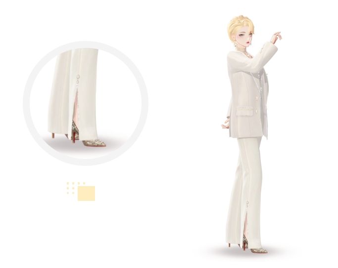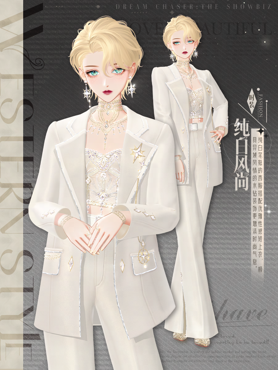 此前《绝对演绎》已经推出过许多优雅浪漫的大裙子,每套时装都让玩家们十分喜爱。当然作为女明星,也少不了一套帅气的西装。因此这个月官方为玩家设计了一套雅痞感十足的白色西装。