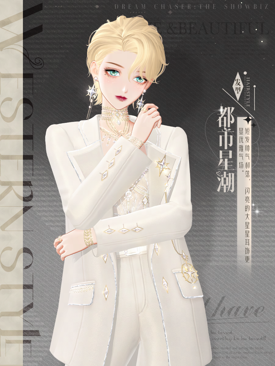 这套花路的发型也让人十分心动,亮眼的金发与白西装搭配,打造矜贵气质,微长的刘海挡住眼眸,若隐若现的撩人氛围油然而生。耀眼的星芒耳环点缀于耳畔,将贵气与不羁融合,让人看一眼便心醉沉迷。