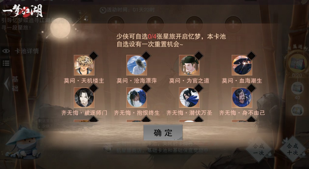 并且,浮生星阵自选UP卡池也已开启,少侠可以自选4张基础卡池中的金卡,自选金卡抽出的概率将大幅提升,不愁抽不到心仪金卡啦。更有全新卡牌退阶功能,助力少侠无忧培养心仪卡牌。
