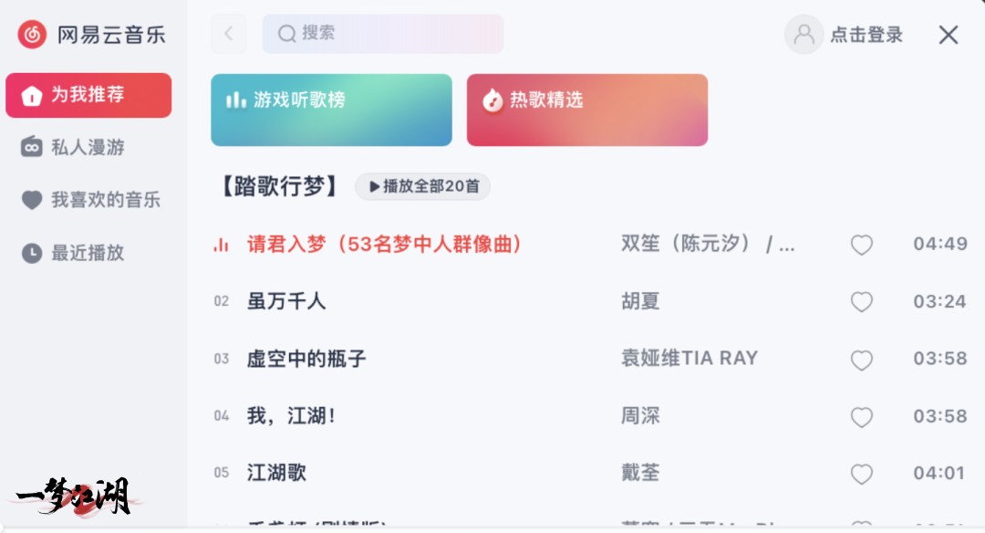 秋季版本更新后网易云音乐也已入驻《一梦江湖》,游戏内置网易云音乐的功能开启测试,测试期间仅IOS及官网安卓端可试用,全端上线很快就来,未来少侠们都可以在游戏里边听音乐边闯荡江湖啦!