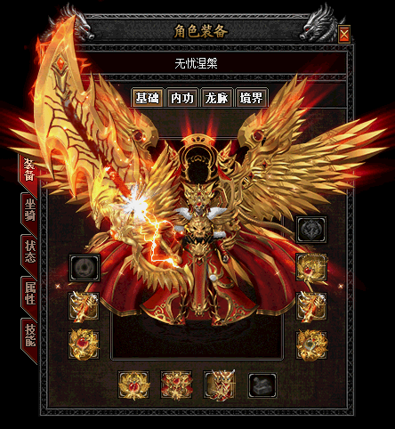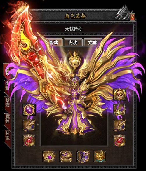 点开无忧传奇的角色属性,玩家可以看到角色的全身照,除此之外还有各个部位穿戴的装备。抬头部分是基础信息、内功信息和龙脉信息,侧面显示的则是装备、坐骑、状态、属性和技能。