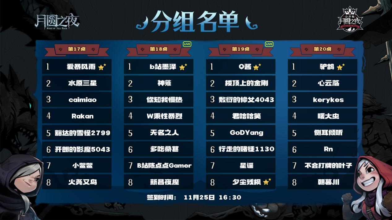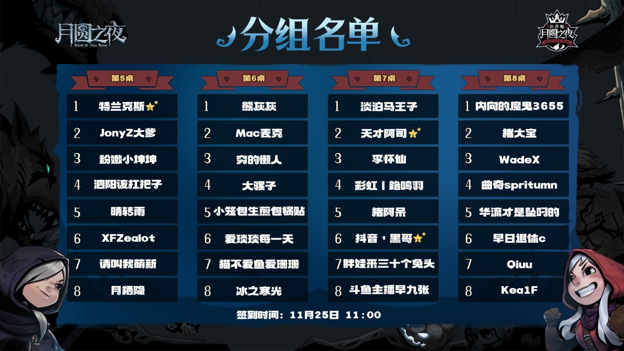 本届公开赛作为《月圆之夜》的第一站,驴鸽、慕容清清、雪妍、千雪、特兰克斯、天才阿司、抖音丶黑哥、b站墨泽、Q酱等知名选手、主播、解说将参与比赛一起为大家带来精彩的现场直播,千万不要错过!