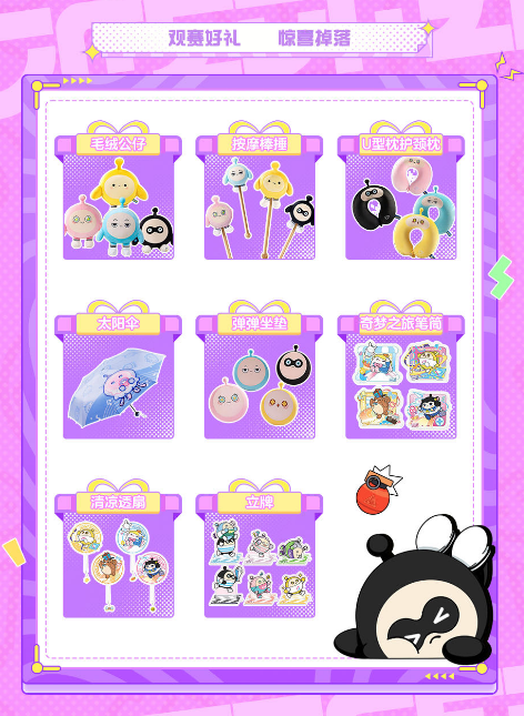 为了回馈广大玩家的热情支持,本届蛋仔冲冲冲巅峰赛准备了丰厚的观赛福利。除了有机会与大咖蛋一起陪玩,更有毛绒公仔、按摩棒捶、U型枕护颈枕、太阳伞、弹弹坐垫、奇幻之旅笔筒、清凉透扇、立牌等精美礼品等你来拿。观赛过程中还有机会获得神秘大礼,千万不要错过!