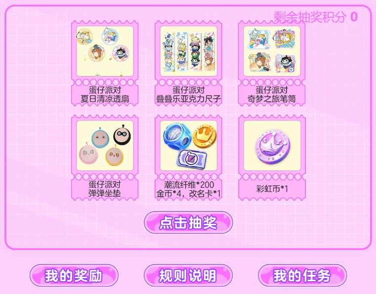 比赛期间,参与小红书抽奖活动,同样有机会获得夏日清凉透扇、叠叠乐亚克力尺子、奇梦之旅笔筒、弹弹坐垫、潮流纤维、金币、改名卡、彩虹币等精美礼品等你来拿。