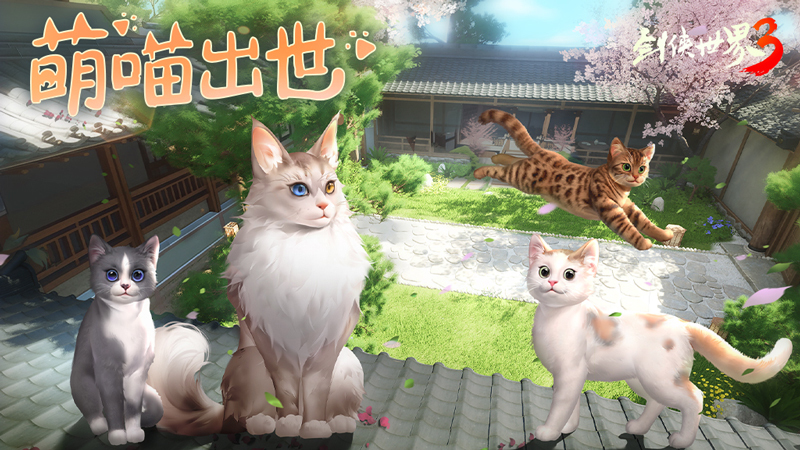 萌喵出世,萌动江湖!这次少侠们终于可以在剑侠世界中拥有“云养猫”自由,实现“猫狗双全”的人生理想啦!本次江湖将为各位少侠解锁四只不同品种、性格各异的超萌猫咪。不仅有智勇双全的缅因猫小因;还有慵懒可爱的英短猫英英;以及自由如风的狸花猫阿狸;呆萌可爱的好奇宝宝团团!快来开启猫咪陪伴的江湖人生吧!