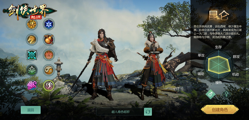 同为土系,昆仑则是分内功剑昆仑与外功刀昆仑,皆为远程,主打控制。剑昆仑能御风使敌人浮空,亦能召雷使敌人眩晕;刀昆仑席卷范围敌人,还能施展技能提高群体攻击,团队作用巨大。