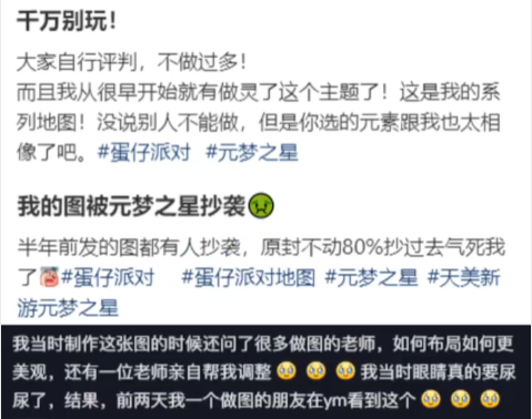 首先,在地图和核心玩法方面,元梦之星与其他派对游戏有很多相似之处。此外,很多玩家在社交媒体上表示,他们在蛋仔中创作的原创地图几乎被原封不动地搬运到了元梦之星。自上线以来,各大平台上都可以看到游戏玩家对此的声讨,指责元梦“抄袭”,这种言论层出不穷。元梦官方对于玩家搬运蛋仔玩家原创地图的行为也没有明确表态。