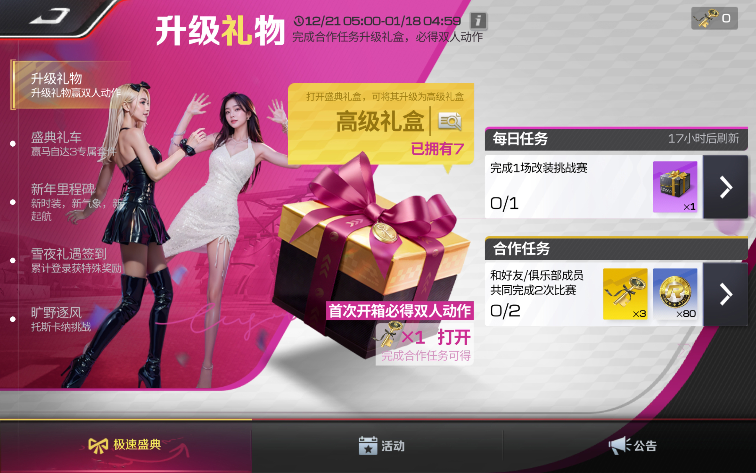 极速盛典“升级礼物”活动持续进行中,完成每日任务获取盛典礼盒,领取海量钻石;完成指定合作任务,还可打开高级礼盒,限定【车顶装饰】、【极速盛典头像框】、海量钻石等奖励等你来开盒,首次打开高级礼盒必定获得全新双人动作【双人成行】!