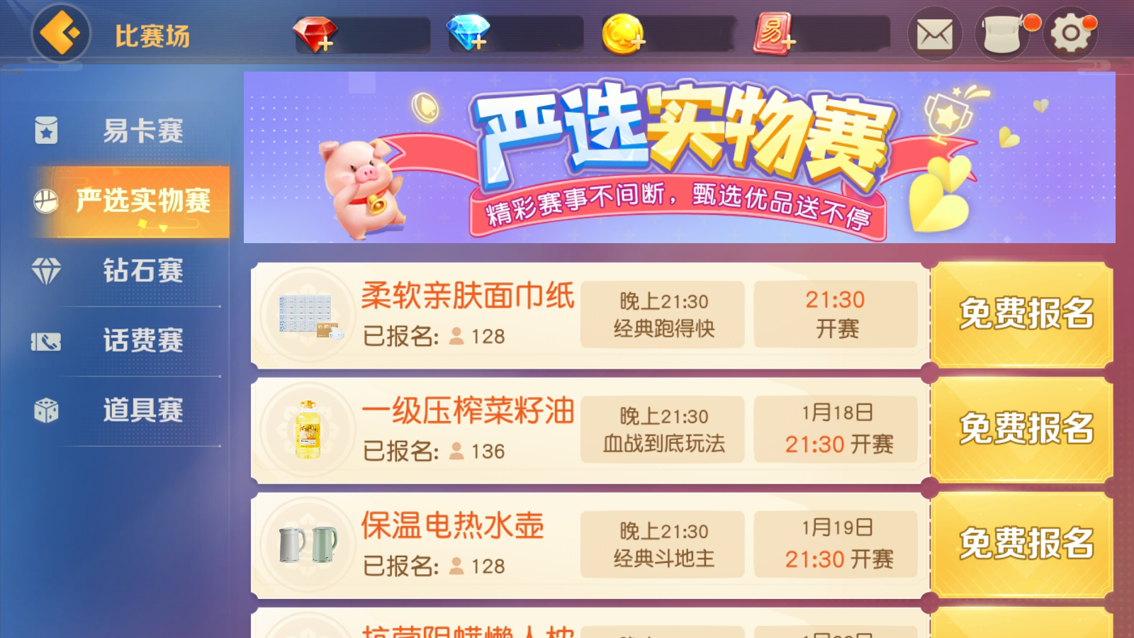 精彩活动不间断,比赛场好礼大放送!《网易棋牌》严选实物赛每周一至周五晚21:30 准时开赛,各位牌友可以前往游戏内,点击首页【比赛场-严选实物赛】免费报名并参赛,今明晚参赛有柔软亲肤面巾纸、一级压榨菜籽油等你赢!