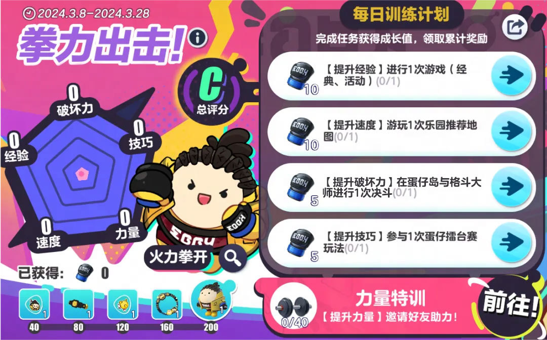 想要成为力敌千钧的拳王,需要经历怎样的刻苦练习?3月8日至28日,【拳力出击】活动热血开启!蛋仔们完成每日训练计划,即可获得力量值,免费解锁力量感满满的外观“火力拳开”、腰饰“金腰带”、动作“训练动作”“决胜”、表情“欢呼”、以及“头像框-冠军”等6件定制福利!参与【勇无止境】活动或前往H5页面参与分享活动,出了可选择自己的格斗家形象并生成专属页面,还能通过请好友助力完成力量突破,更快增加力量值!