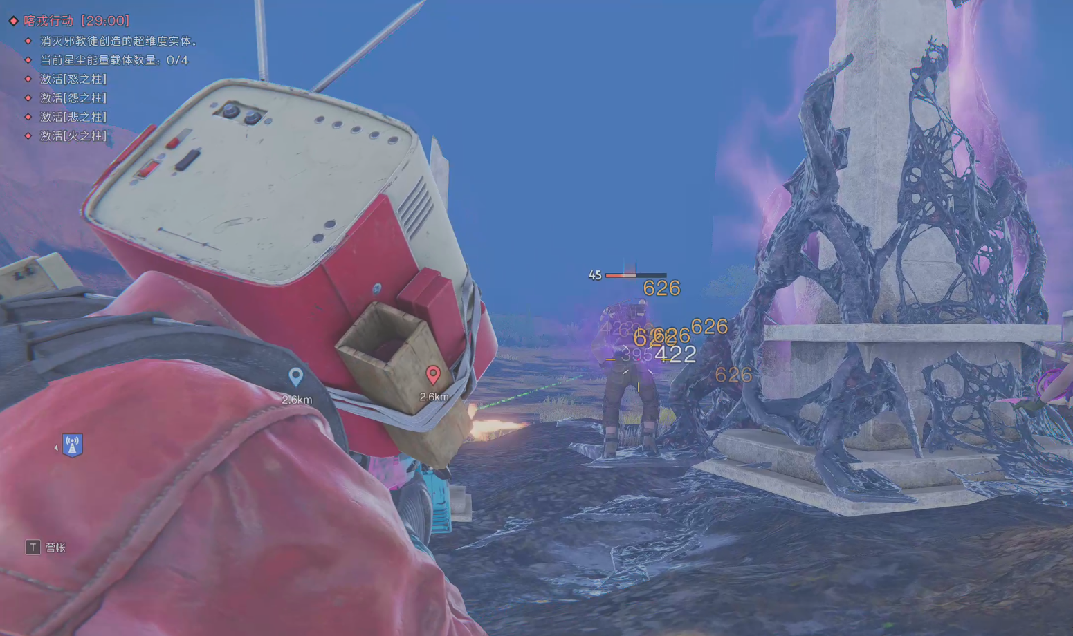 一段时间后,肯陶洛斯降临,此时它是无敌的,超越者们需要激活场景内的“怒之柱”“怨之柱”“悲之柱”和“火之柱”,和这些柱子互动就能完成激活,随后肯陶洛斯就会脱离“无敌”状态,这个超维度实体看起来凶神恶煞,但血量并没有高得离谱,和队友趁这个时间集火它,就可以轻松将其消灭,并获得事件奖励了。