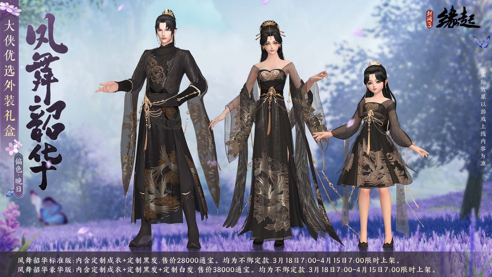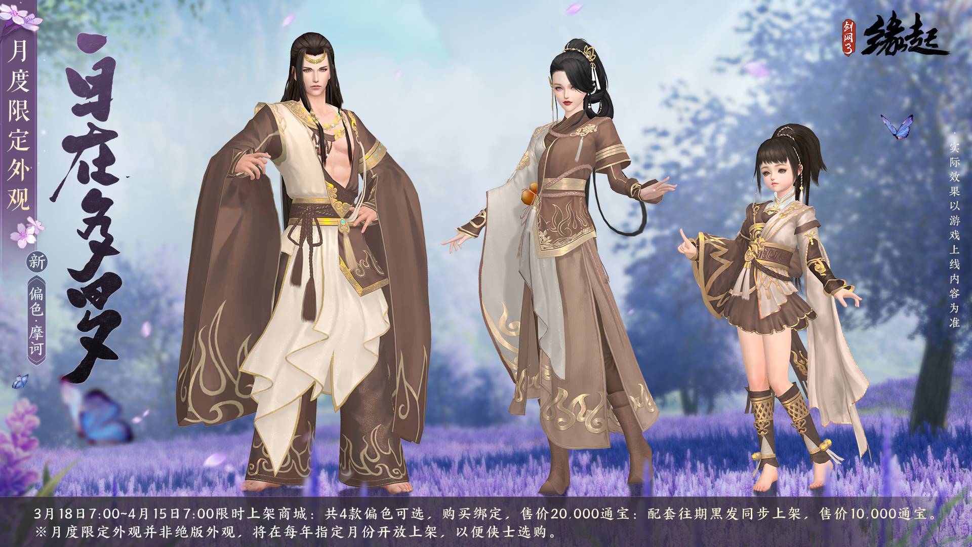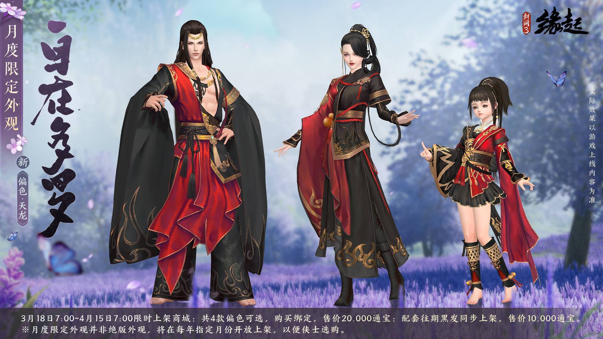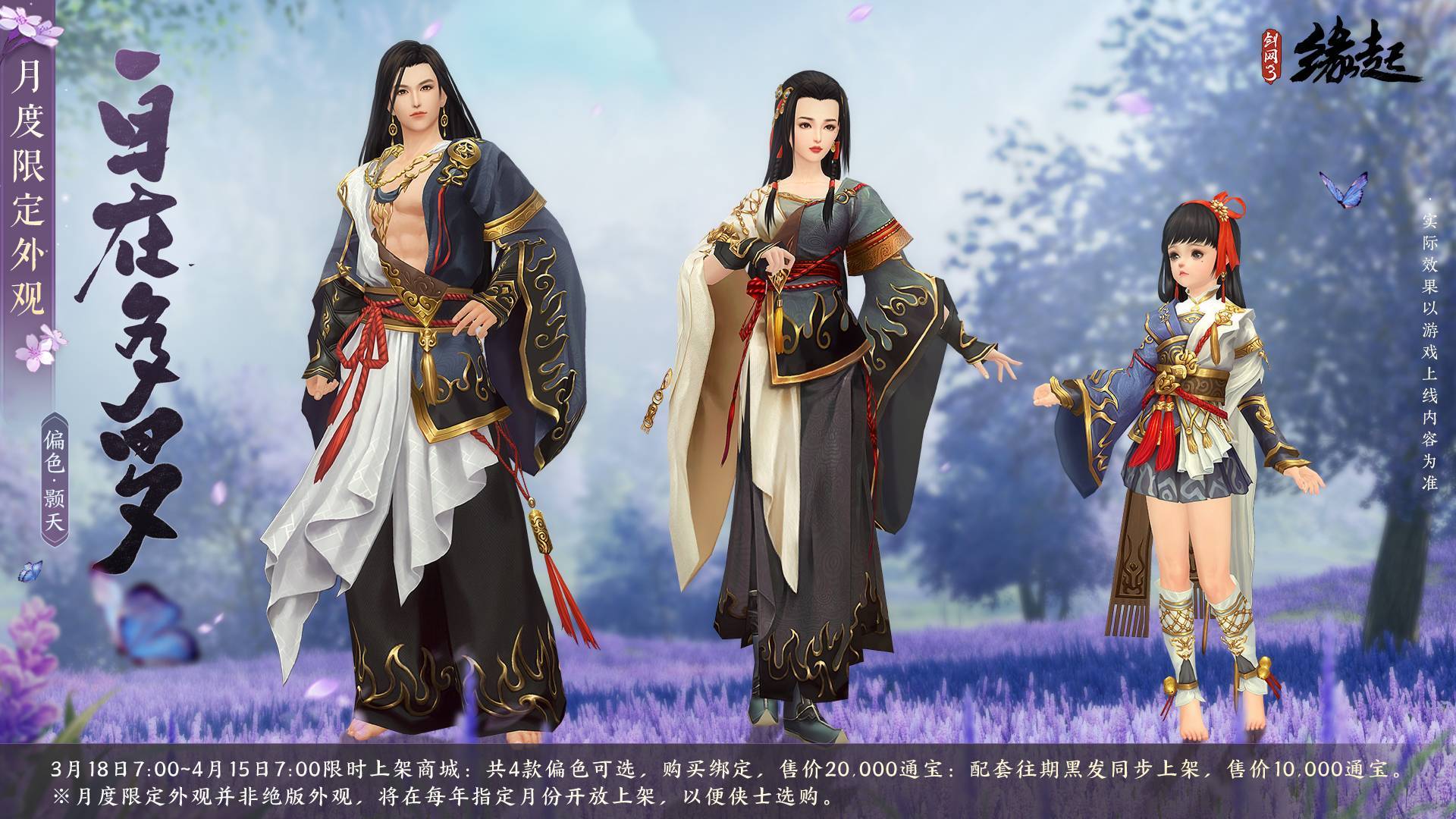 经典外装「自在多罗」双色「颢天」、「炽盛」限时返场!两款新偏色「天龙」、「摩诃」同步登场。服饰版型简洁潇洒,独具特色,鎏金花纹耀眼夺目,尽显江湖侠士气息。