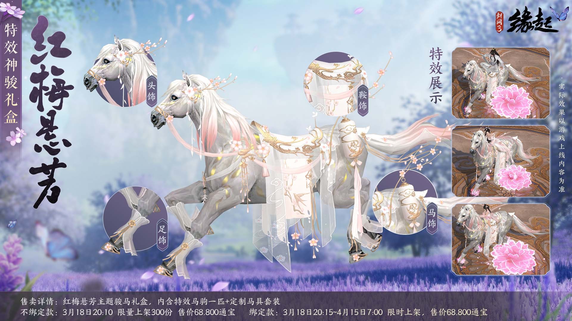 花开花落马蹄过,春色盎然醉人心。马蹄落处梅花隐隐浮现,幽香飘逸。奔马疾驰,梅花飘舞,蝶影婆娑,美丽绝伦。红梅悬芳主题骏马礼盒包含特效神驹一匹和同主题定制马具套装。