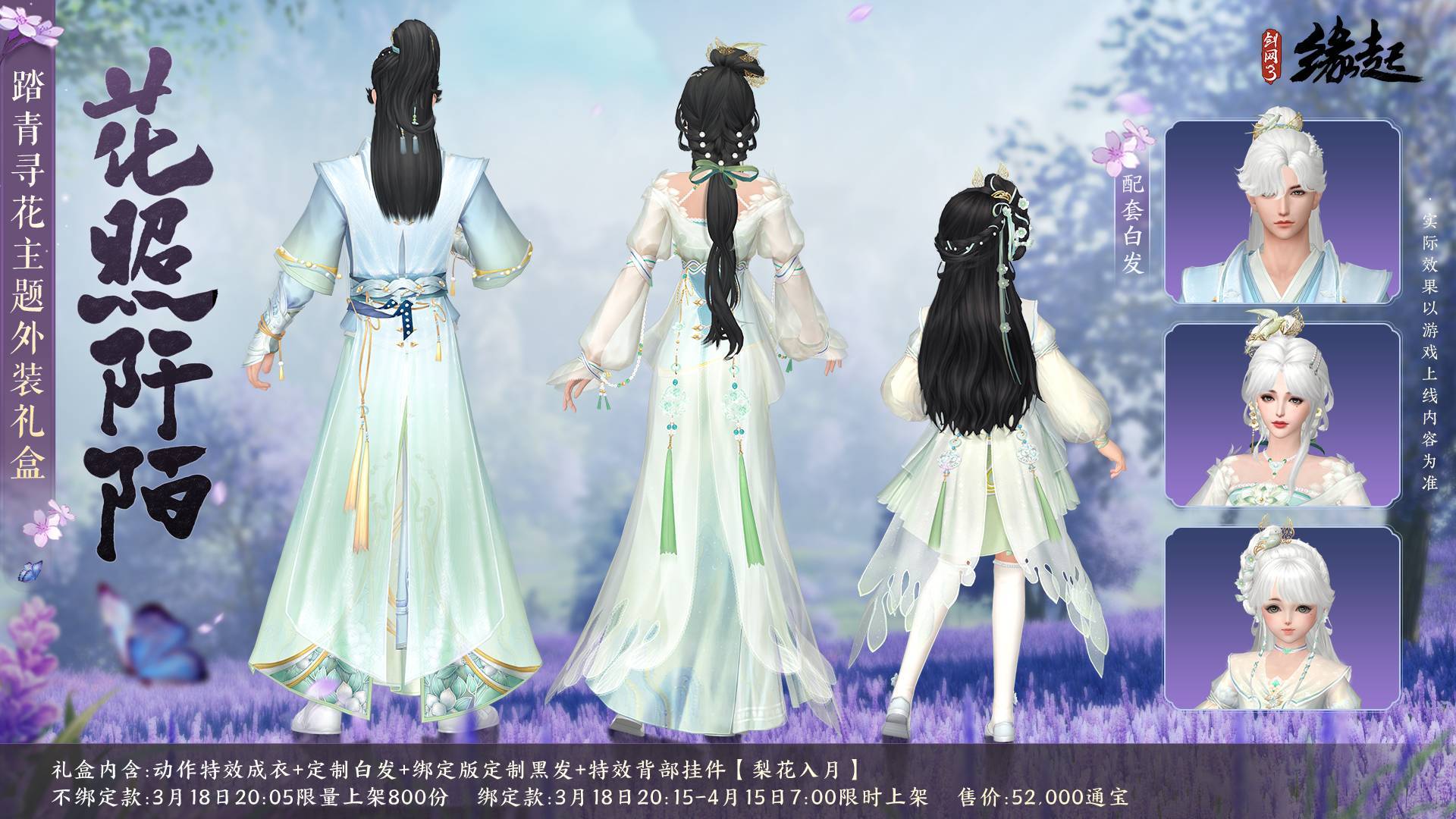 踏青主题礼盒「花照阡陌」包含动作特效成衣+定制白发+绑定版定制黑发+特效背部挂件「梨花入月」,分为绑定款和不绑定款。