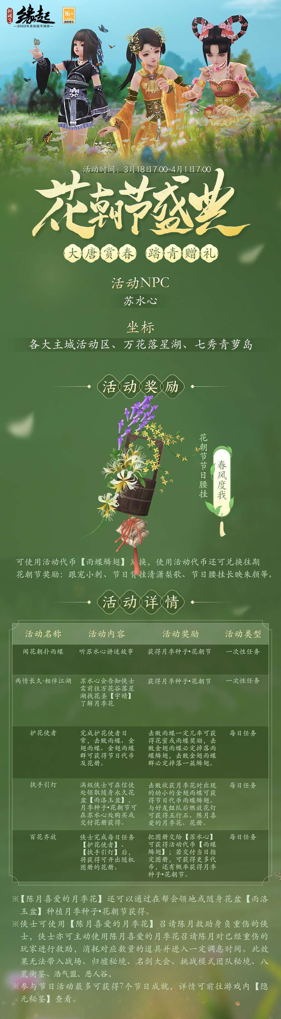 繁花迎春艳,和风舞柳阴,花朝是游春扑蝶的好时候。3月18日7:00~4月1日7:00活动期间,侠士在各大主城活动区、万花落星湖、七秀青萝岛找到NPC苏水心参与节日活动即可获取活动代币「雨蝶鳞翅」,兑换花朝节节日不限时绑定腰挂「春风度我」!柳暗逢花明,春风可度我,愿君一世顺遂,平安喜乐。