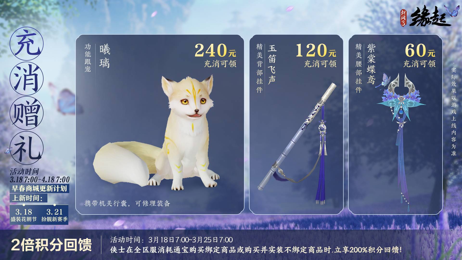 全新功能跟宠「曦璃」惊喜登场!该宠物携带机关行囊,可协助侠士修理装备。3月18日7:00~4月18日7:00,充消达240元可领取不限时绑定小狐狸跟宠「曦璃」。侠士充消120元可领取精美背部挂件「玉笛飞声」,充消60元可领精美腰部挂件「紫棠蝶鸢」。