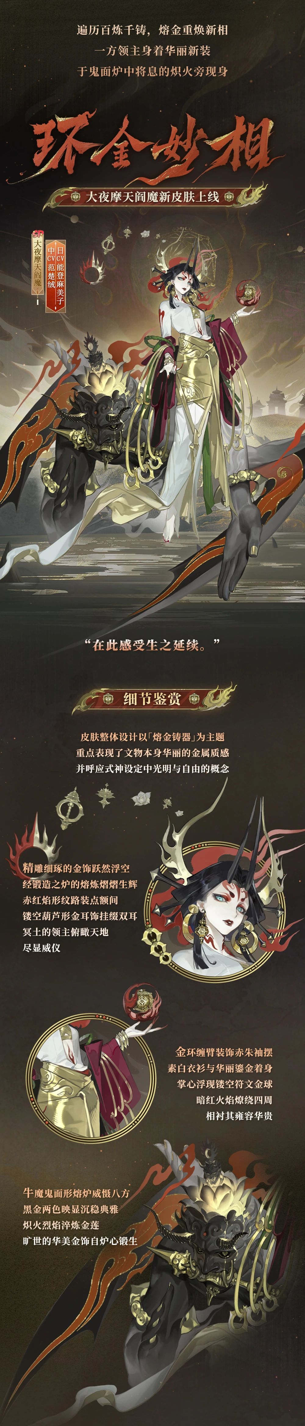 精雕细琢的金饰跃然浮空,经锻造之炉的熔炼熠熠生辉。赤红焰形纹路装点额间,镂空葫芦形金耳饰挂缀双耳,冥土的领主俯瞰天地,尽显威仪。