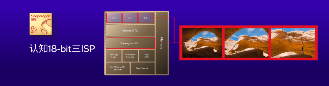 以影像为例,第三代骁龙 8s 集成了认知 18-bit 三 ISP,可通过高达 18bit 的数据采样让摄像头每秒处理数十亿像素。搭配第二代图像分割功能,支持照片和视频实时语义分割,带来比竞品近 2.5 倍的提升。当这一切与芯片强大的 AI 处理器结合,摄像头也真正开始「看见并理解世界」,无论是暗光拍摄的画质表现,还是 AI 识图、修图、扩图等功能,都将得到质的飞跃。 当然,之所以叫「认知」,是因为其在第二代骁龙 8 时便实现了通过 Hexagon 直连的方式,将 ISP 与 Hexagon NPU 直接连接,让 ISP 具备强大 AI 分析的能力,从而在拍摄过程中将 AI 优化提前,实现实时语义分割,让甚至于眼镜反光的每个拍摄细节都能得到更为精细的优化,而且是实时的反馈,从而大大提升手机成像质量和拍摄体验。这就是高通 AI 引擎和 ISP 联手的深藏功与名之处。