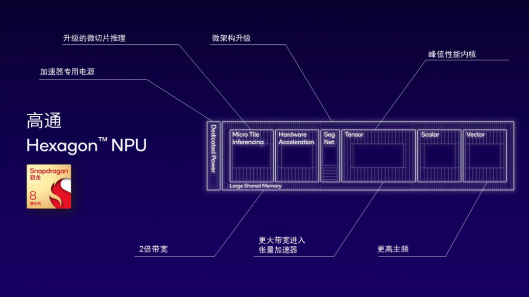 骁龙在 AI 领域的进化,并非简单的算力提升,而是通过各个环节的底层技术革新来实现的:升级的 Hexagon 作为一块专用的 AI 神经网络处理器,在更低功耗的同时大大提升了 AI 运算性能。 骁龙 8 系列还在硬件层面引入了微切片推理(Micro Inferencing)等前沿 AI 技术,在时间轴上对神经网络的不同层次进行切分,让多个切片在同一时刻并行计算,从而确保芯片处理器始终保持高效的运转状态,极大地提高了 AI 推理效率。