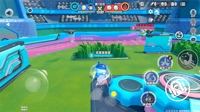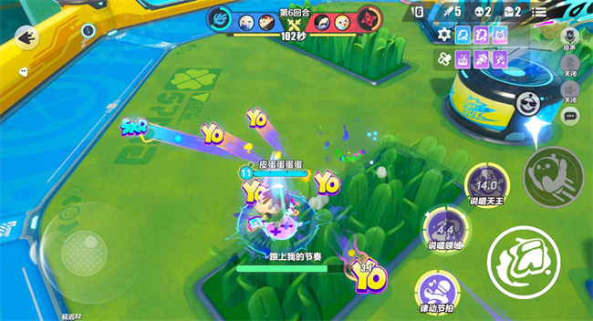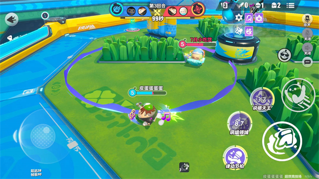 施展二技能“说唱领域”,饶舌诗人扔出话筒向四周扩散音波,让被命中的蛋仔在音乐中失控。