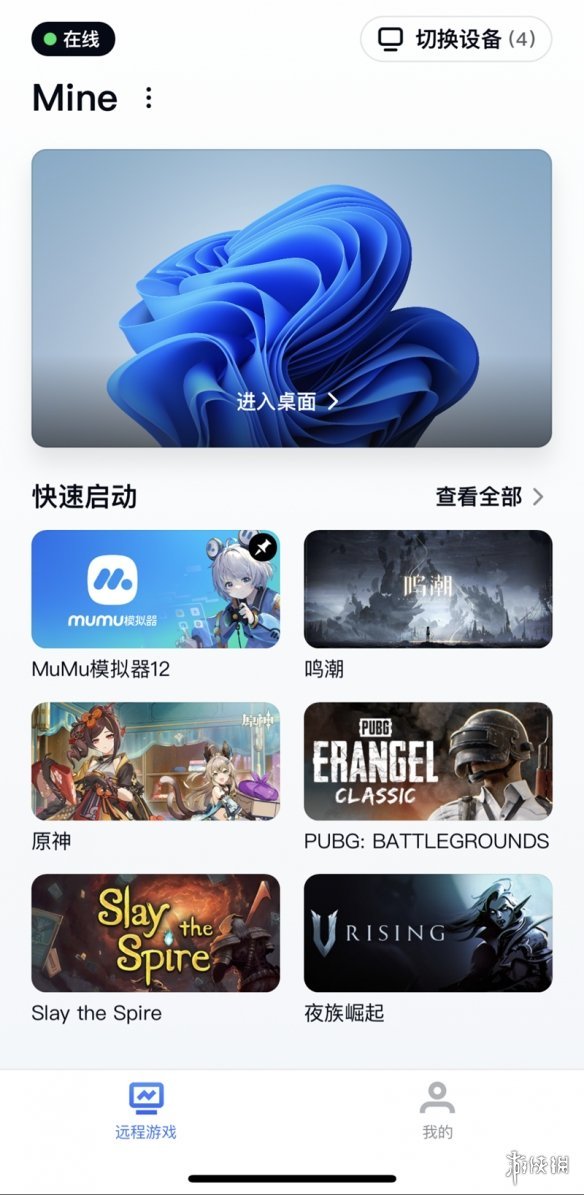 3、手机云玩《鸣潮》,在手机端GameViewer远程游戏界面,选择安装了游戏的在线电脑设备,再点击快速启动中的《鸣潮》,进入远控电脑界面;