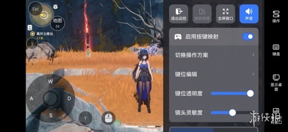 4、点击右上角操作按钮,启用按键映射,并切换操作方案至云方案-鸣潮,就可以实现角色移动、战斗的丝滑操作。如觉得操作方案不够顺畅,可以自定义编辑键位和调整键位透明度、镜头灵敏度。