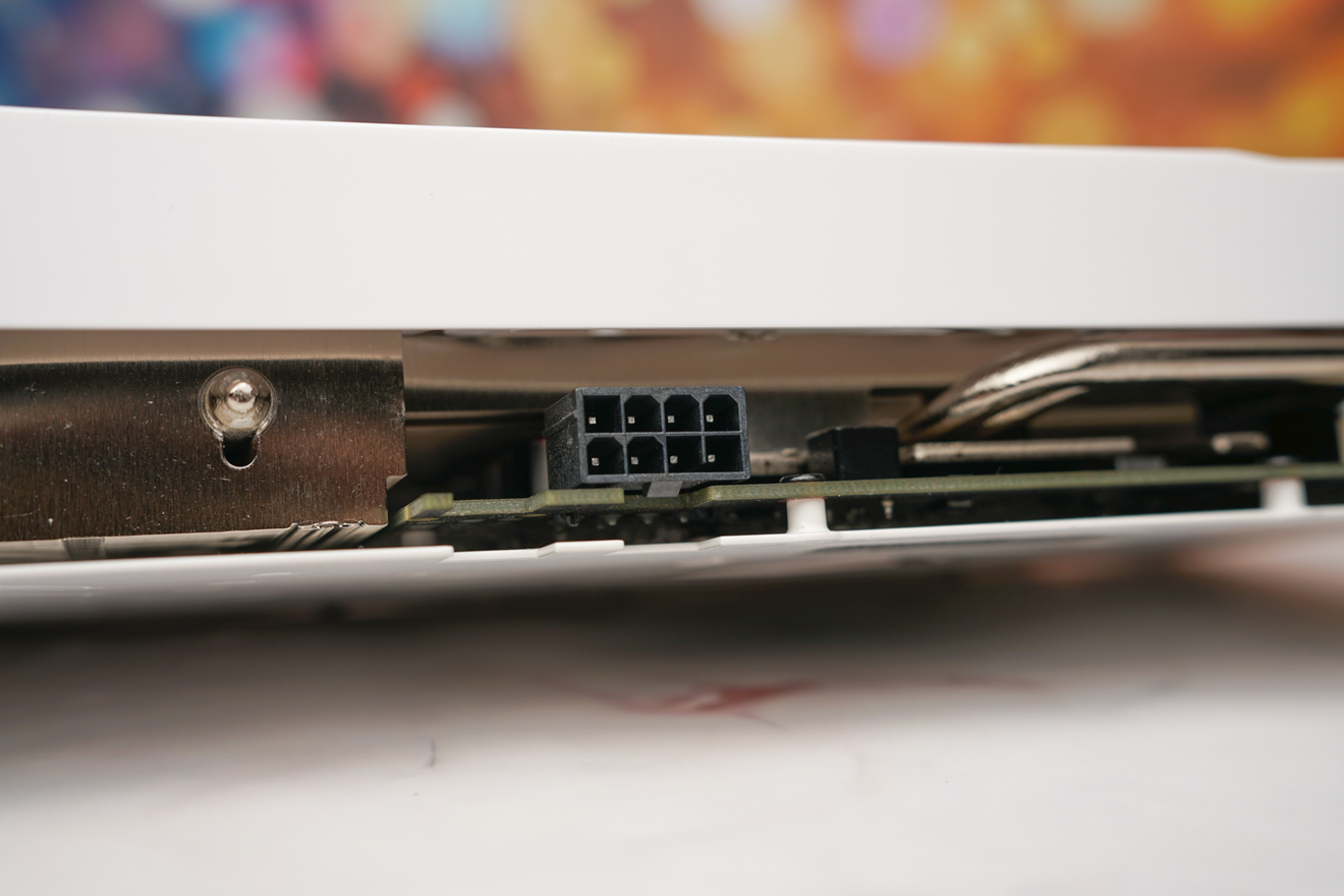 在显卡的侧面处,我们可以看到艾尔莎RTX3060幻雷者12G使用了一个8pin供电接口,用来满足170W的单卡功耗完全没问题,电源搭配推荐使用550W及以上的功率。