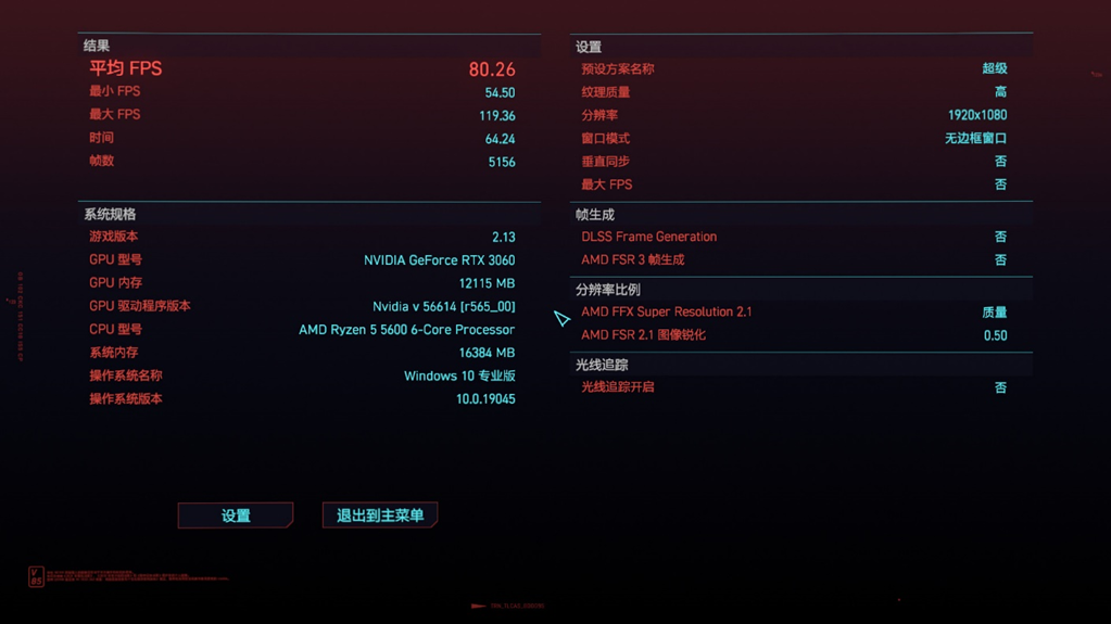 然后是另外一款热门3A大作《赛博朋克2077》,这里我们将会测试不开启光追和开启光追两种情况。