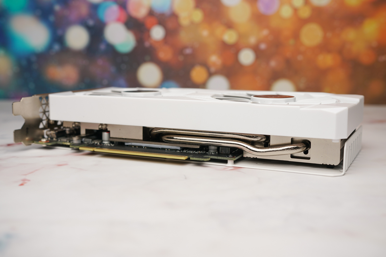 仔细观察的话,我们还可以看到艾尔莎RTX3060幻雷者12G的散热鳍片相当密集,而且上面还贯穿了两根8mm的镀镍热管,整体规格相当优秀。