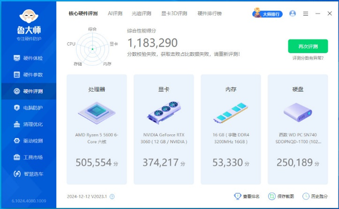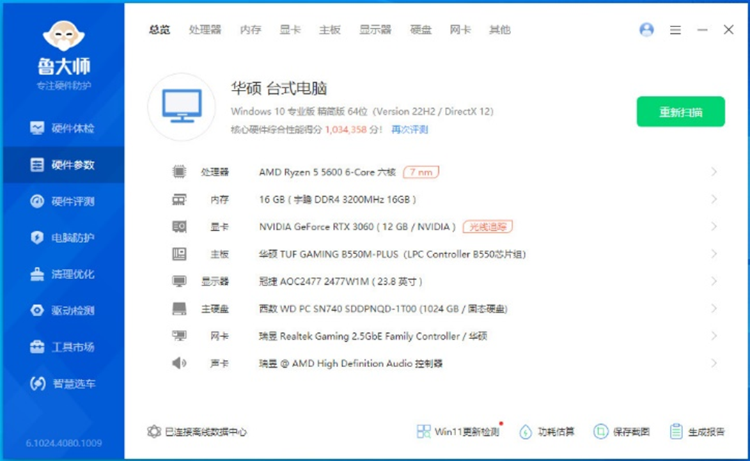 首先是鲁大师的信息检测,这里使用的是AMD的锐龙5 5600处理器+16GB DDR4 3200内存+B550主板进行搭配。