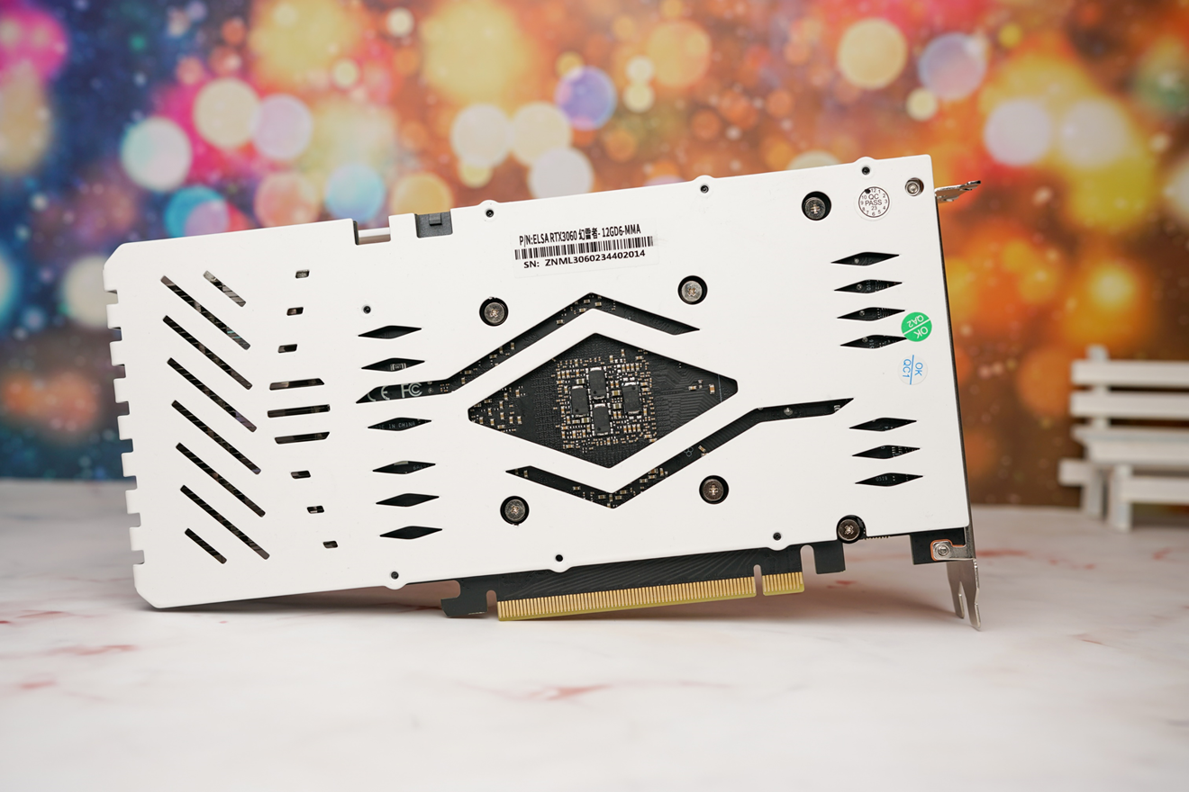 在显卡的背面处,艾尔莎RTX3060幻雷者12G使用了一块全白色的金属背板,上面有菱形与线条构成的镂空,看起来很有个性,就算是长时间使用也不用担心PCB受重力影响而弯曲变形。