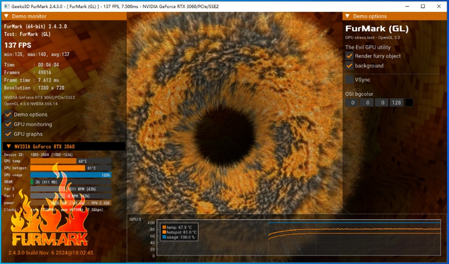 温度方面,在对显卡进行了6分钟的Furmark持续满载测试下,艾尔莎RTX3060幻雷者12G的核心温度为67.9℃,热点温度为81℃,此时风扇转速仅为1511RPM,散热与静音效果出众,日常使用完全不用担心温度和噪音的问题。