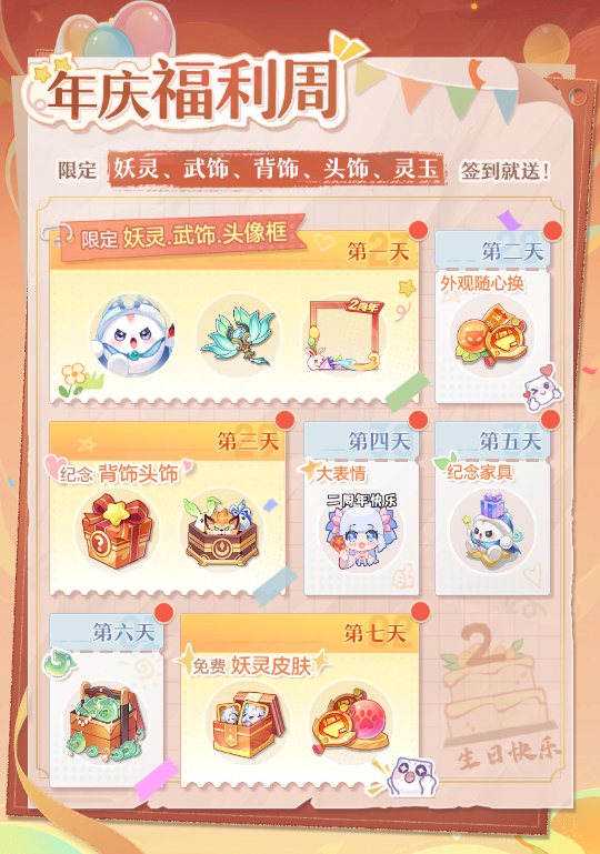欢庆二周年,豪礼送不停!惊喜福利周来临,登录即可领取海量豪礼!御灵师在活动期间登录签到即可领取周年限定宠、纪念武饰、背饰、头饰、妖灵皮肤,以及灵玉、坊市五折券、绮罗华章、妖灵成长果等惊喜福利!