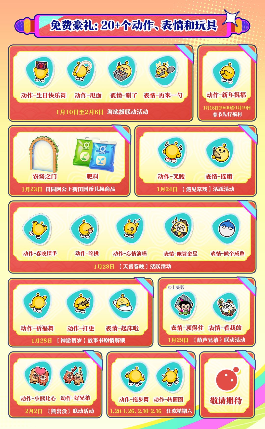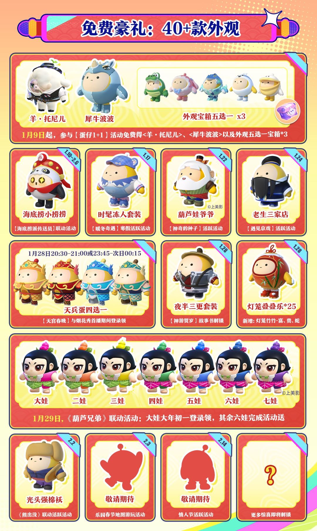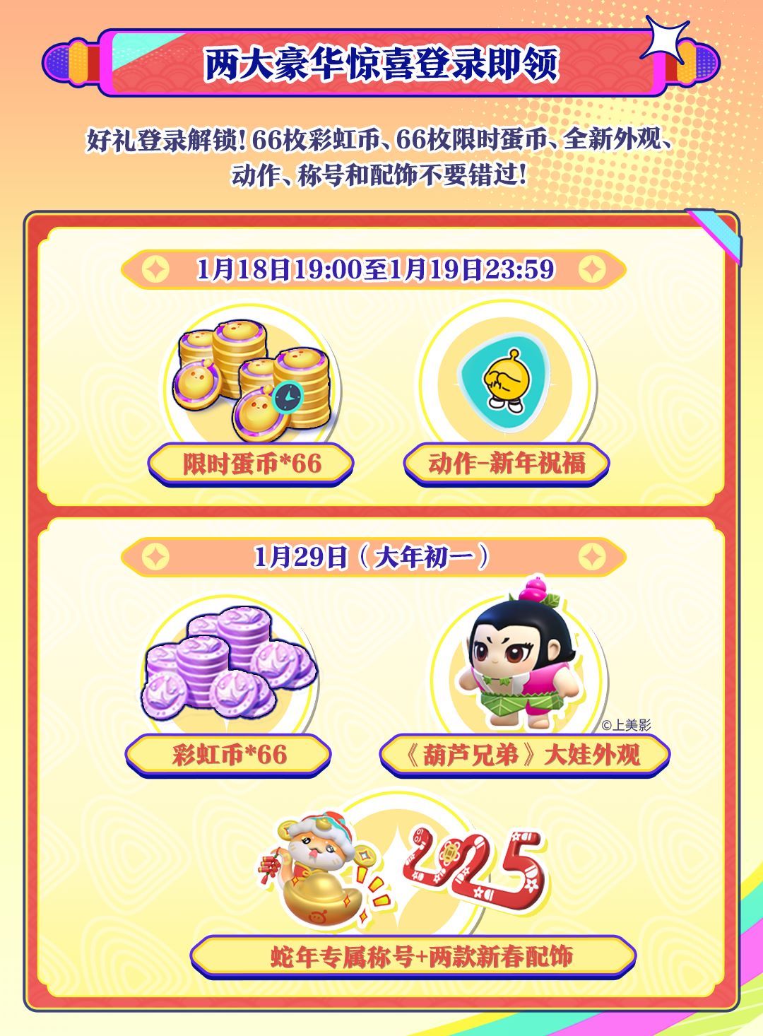 上岛就送,登录即领!1月18日19:00-1月19日23:59,登录即可领取66枚限时蛋币,以及动作“新年祝福”;1月29日大年初一当天,66枚彩虹币、《葫芦兄弟》大娃外观、蛇年专属称号以及两款新春配饰登录即领。小蛋仔们记得准时登岛,接住这泼天的福利!