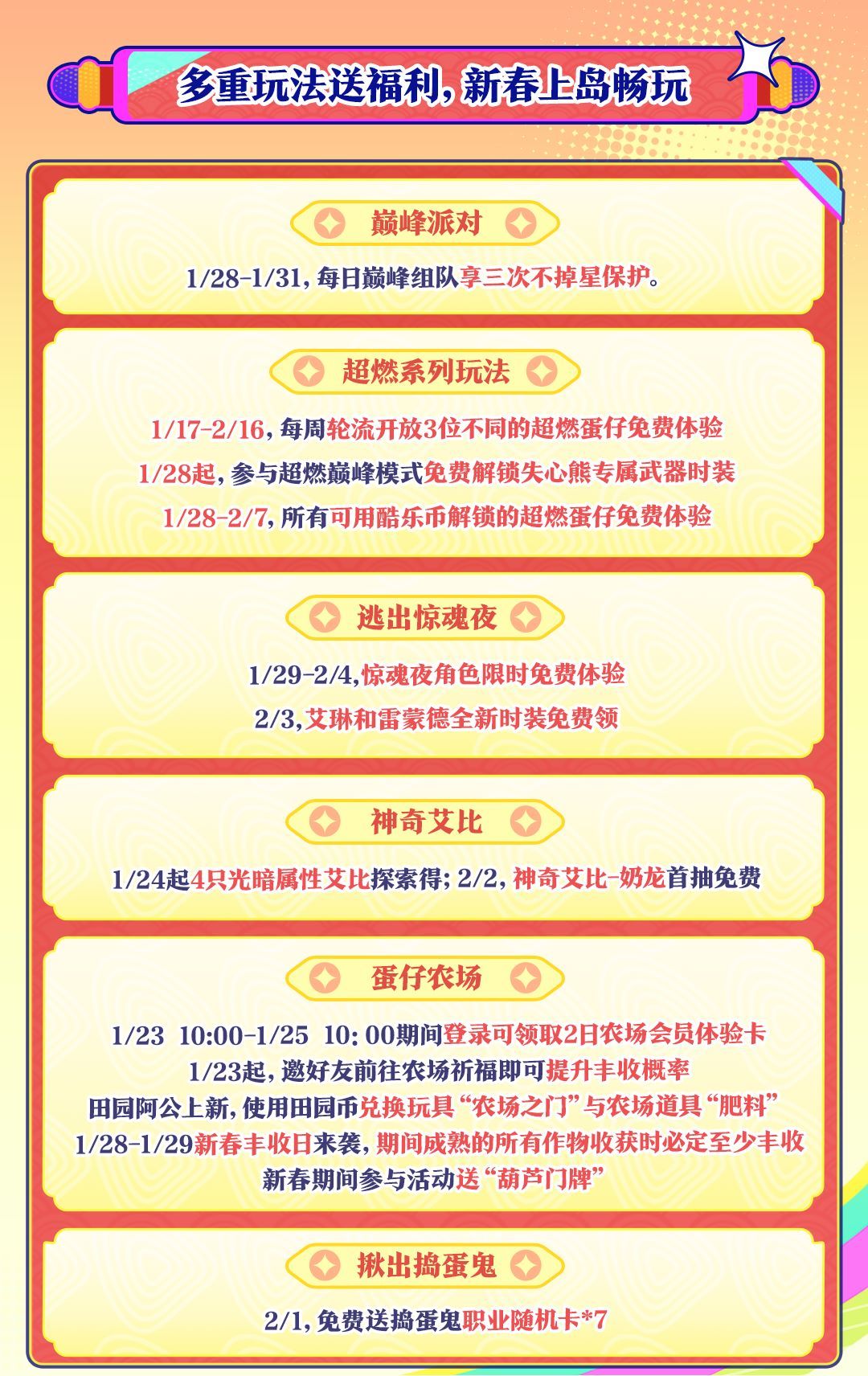 新春佳节除了穿搭福利要到位,玩法福利也要给小蛋仔们安排得明明白白!6大玩法齐送福利,新春上岛玩到爽!