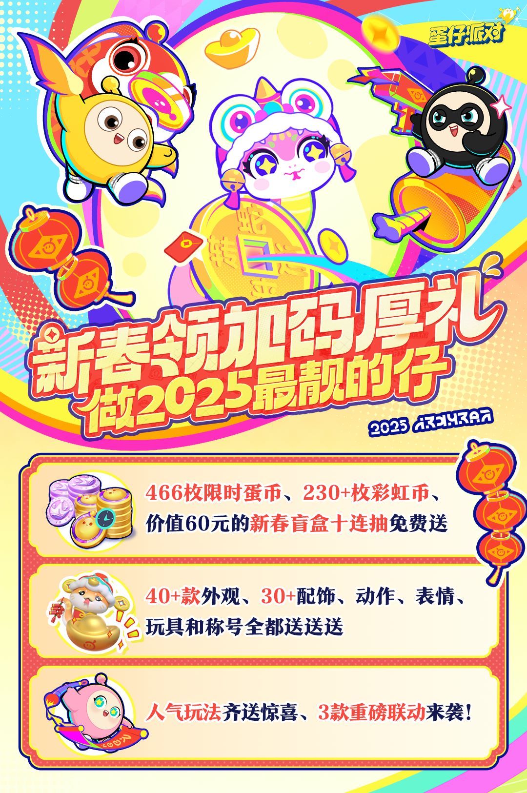 蛇年接好运、接上岸、也要接住蛋仔的新春泼天福利。国民原创乐园游戏《蛋仔派对》新春福利合集已整理好,466枚限时蛋币、230+枚彩虹币、40+款外观……说送就送不玩虚,速速共读以下新春版本福利合集,一起上岛成为2025最“壕”、最靓的仔!