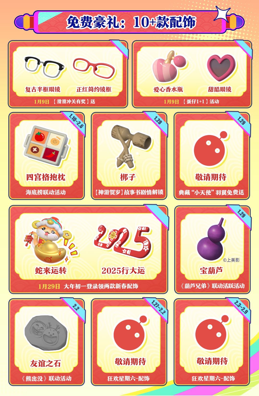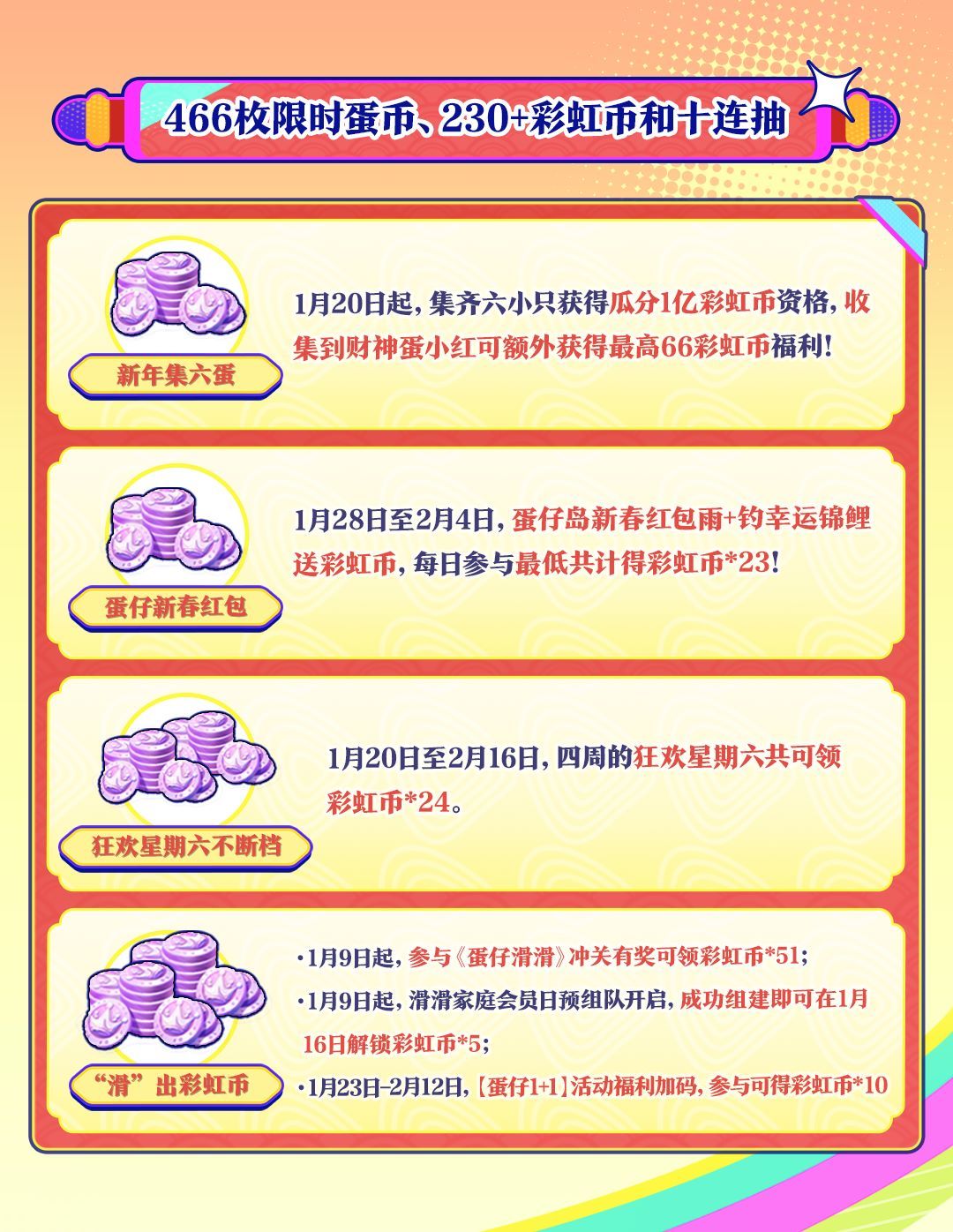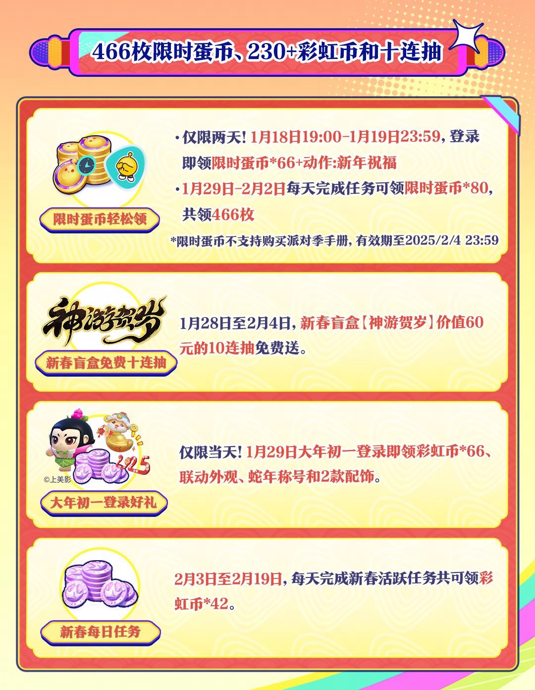 1月18日开始,将陆续为大家献上466枚限时蛋币、230+枚彩虹币;1月28日-2月4日,新春盲盒“神游贺岁”价值60元的10连抽免费送……蛇年新春,来蛋仔岛过就对了,包壕的!