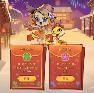 新年开红包,吉祥如意绕!1月30日00:00~2月10日23:59前往游戏中完成完成幸运任务/获胜任务,可开启幸运红包/获胜红包,两种红包,双份大礼。开启红包可获得随机奖励:珍藏棋盒,南瓜币,互动礼物。累计完成固定数量的任务还可领取更多神秘奖励。