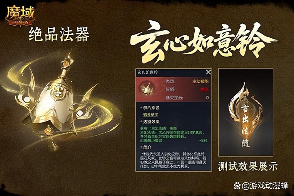 法器分为良品、上品、精品、极品、绝品五大品阶,每个品阶都有其独特价值。从基础属性加成到强力特效,不同品阶的法器满足玩家在不同阶段的需求。例如,极品法器“轮回塔”自带幸运幻化效果,是幻兽冲星的绝佳利器;而绝品法器“玄心如意铃”,不仅能增加幻兽最小魔攻,其“言出法随”技能还可自定义四字真言,释放时文字横空出世,视觉效果拉满!