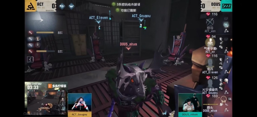 第一天DOU5 vs ACT第二局上半场,DOU5_mhxm鹿头迅速击倒节奏不断,来回拉扯稳定四抓:DOU5_mhxm鹿头开局选择追击祭司,开局一分钟击倒祭司,随后佣兵稳定救下祭司,DOU5_mhxm鹿头选择将祭司挂至遗产机,在气象学家再次救下祭司后将祭司秒杀稳定挂飞。随后通过携带的移行追上气象学家并击倒挂入地下室,并且成功拦截火灾调查员的救援,在气象学家被挂飞后,拉扯剩余两名求生者,稳扎稳打拿下四抓。