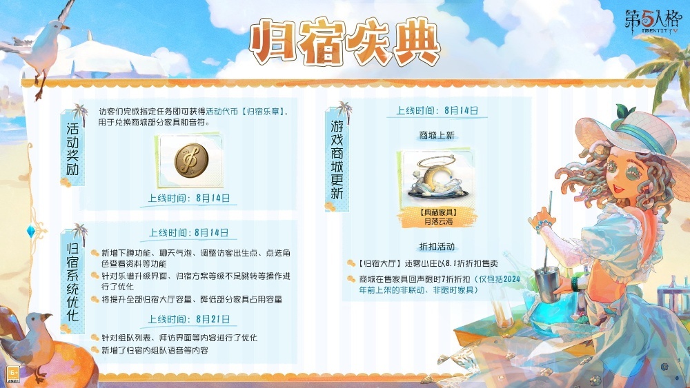 8月14日,归宿庆典活动也将同期上线,访客们完成指定任务即可获得活动代币【归宿乐章】,用于兑换商城部分家具和音符。活动期间,【典藏家具】月落云海上线游戏商城;【归宿大厅】迷雾山庄以8.1折折扣售卖;商城在售家具回声限时7折折扣(仅包括2024年前上架的非联动、非限时家具)。