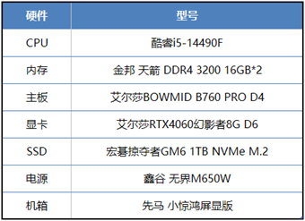 结合《四海兄弟:故乡》的配置要求,我们准备了一套能够畅玩该作的游戏配置。从硬件的选择和搭配来看,该配置使用的是酷睿i5-14490F处理器、B760主板以及RTX4060显卡,内存和固态是32GB的DDR4 3200套装以及1TB的PCIe 4.0硬盘,整体性能基本可以满足到《四海兄弟:故乡》以及其它热门单机和网游的需求,其中主板和显卡部分还采用了老牌厂商艾尔莎的产品,做工和性能足够可靠。当然,预算充足或者要求比较高的朋友还可以根据自己的情况选择性能更强的显卡。